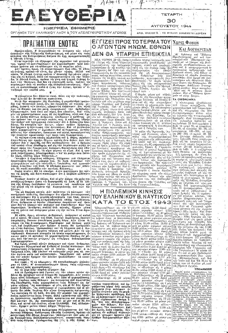 Το πρώτο φύλλο της δισέλιδης αρχικά εφημερίδας, εκδόθηκε παράνομα στην κατεχόμενη από τους Γερμανούς Αθήνα, στις 24 Αυγούστου του 1944, ως επίσημο όργανο της εξόριστης ελληνικής κυβέρνησης του Γεωργίου Παπανδρέου και κατά τον καθηγητή Ηλία Νικολακόπουλο, «συσπείρωσε σχετικά νέους ανθρώπους, με αντιστασιακή δράση και αντιμοναρχική τοποθέτηση».